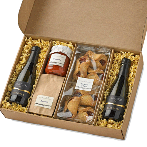 2 Fl. Prosecco Casa Defra Frizzante DOC, Alk. 10,5% vol., je 200ml, Farfalline al Farro, köstliche Teigschmetterlinge mit Waldbeerenfüllung, 150g, Bruschetta, feiner Tomatenaufstrich, 180g, Amaretti, weiches italienisches Mandelgebäck, 40g