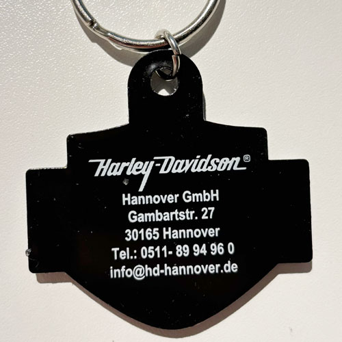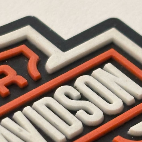 Beim Beispiel von Harley-Davidson ist die vertiefte Ebene schwarz. Die erhabene Ebene ist weiss und orange. Die Rückseite ist glatt und kann individuell bedruckt werden.