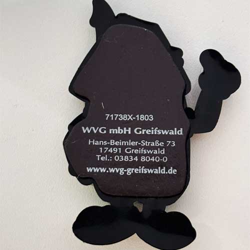 Die Figur auf dem Beispielbild ist plastisch ausgeformt. Die Schrift ist wie bei der 2D-Front erhaben. Die Rückseite ist ebenfalls glatt und kann bedruckt werden.