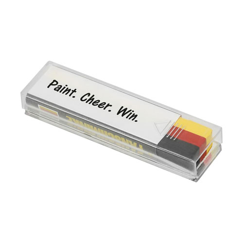 Unsere Fanschminke in Deutschlandfarben ist ein praktischer und aufmerksamkeitsstarker Werbeartikel für Veranstaltungen, Sportevents oder saisonale Kampagnen. Durch die clevere Stiftform lassen sich die Farben Schwarz, Rot und Gold in einem Zug auftragen – perfekt für schnelle Anwendungen bei großen Besucherzahlen.