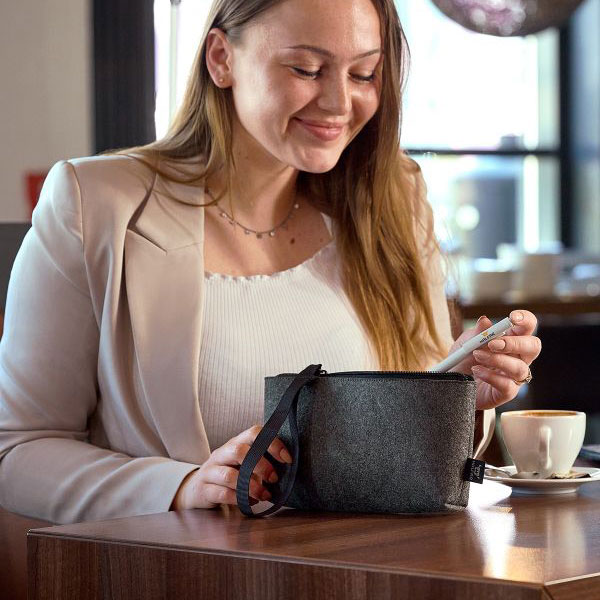 Der dunkelgraue Recycling-Filz wirkt hochwertig, modern und passt zu vielen Markenauftritten – von Agentur über IT-Unternehmen bis hin zu Kosmetik, Fashion oder Tourismus. Dein Logo hebt sich klar von der Filzoberfläche ab und ist bei jedem Griff zum Etui präsent, ohne aufdringlich zu wirken.